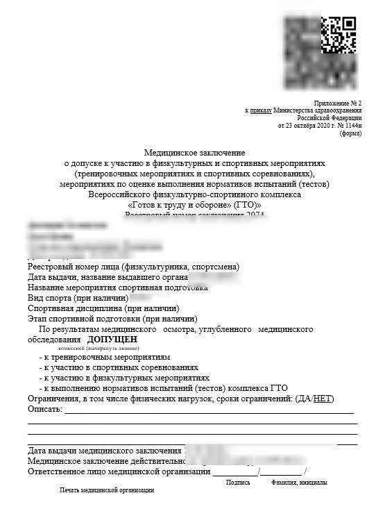 После проведения нагрузочных тестов специалист в области спортивной медицины выдает справку-допуск для участия в соревнованиях. Если по результатам обследования спортсмену была присвоена 3 или 4 группа здоровья, необходимость в дополнительном обследовании и допуске к занятиям принимается индивидуально, в зависимости от состояния здоровья и выявленных рисков.